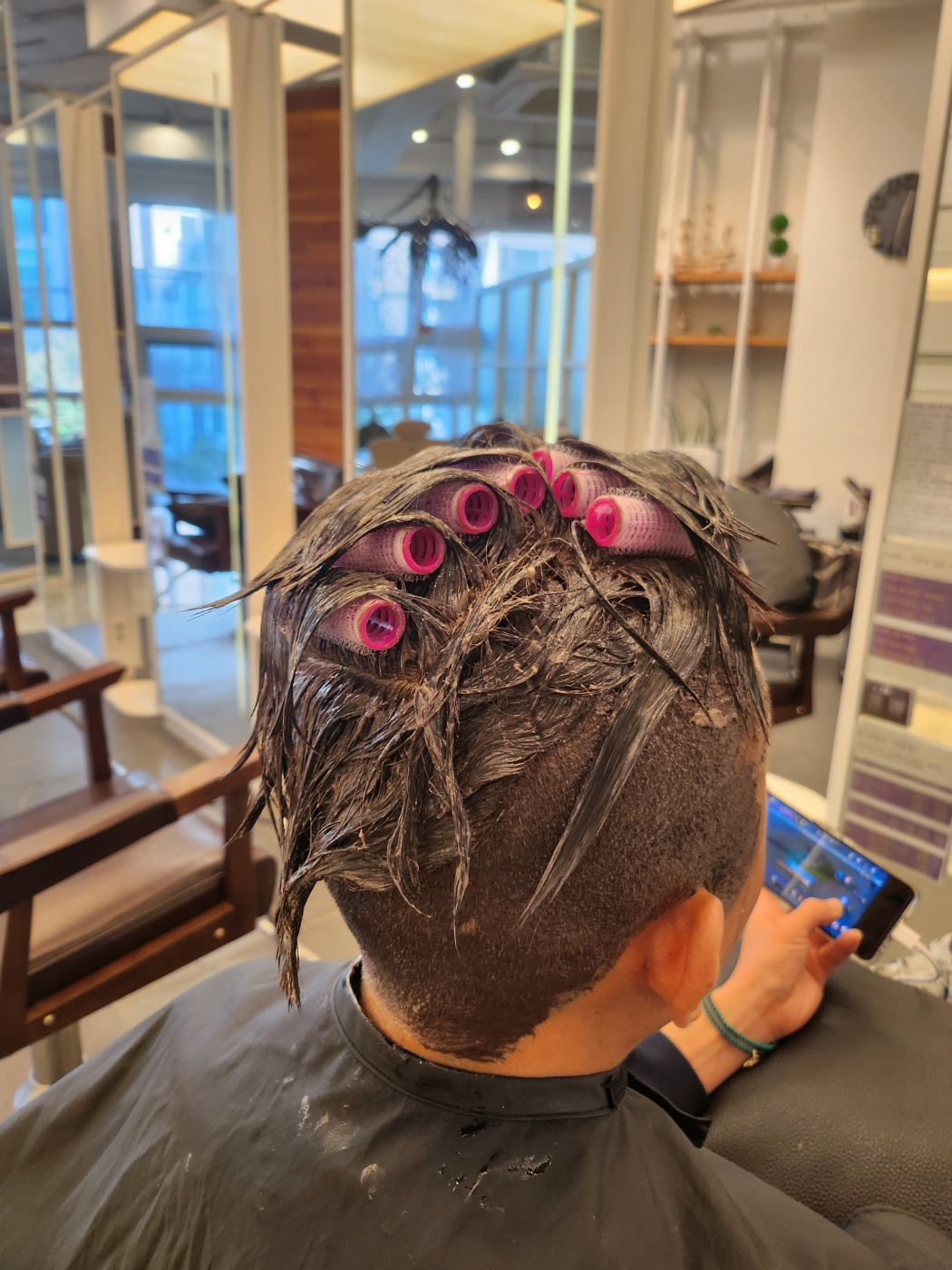 우측섹션을 1~2센티 간격으로 4~5단정도로 나누어주고 두피에서 1~2센티가량을 띄운후 2~3센티정도 염색붓으로 퐁당뿌리볼륨펌약을 도포해주고 각도를 120도이상 든 상태에서 두피쪽에 구르프를 끼우고 모발을 텐션을 주어 그대로 올려줍니다.